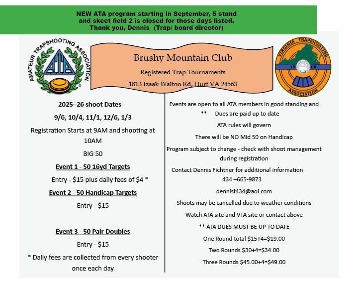 Brushy Mountain Club hosts various skeet, sporting clay, trap, and rifle events throughout the year including Va State Sporting Clay Shoot,4-H Shotgun Championship, Steel Challenge & 22LR Benchrest competitions. We are also a Proud Host of the GSSF Outdoor Match. The club also hosts various fun shoots to support local charities. BMC hopes that you will be able to join us for these events. Events will be noted on the calendar of events.